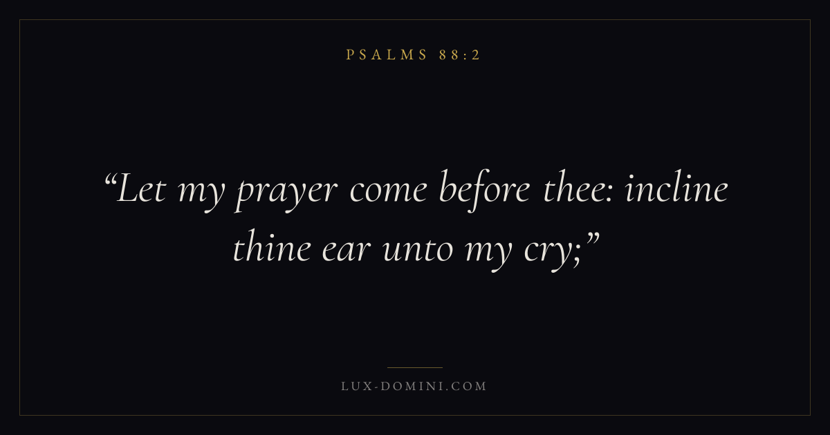 Books / Psalms / Chapter 88 / Verse 2 ← Psalms 88:1 Psalms 88:2 Psalms 88:3 → Let my prayer come before thee: incline thine ear unto my cry; Download verse card Share on Twitter Share on Facebook Pin it ✦ Key themes FaithSuffering and trialsPrayerPraise Read with Hebrews 11:1Romans 10:17Romans 8:182 Corinthians 4:17 Related topics Bible verses about faithBible verses about suffering and trialsBible verses about prayerBible verses about thankfulness and gratitude ✦ Psalms Chapter 88 verses V. 1 V. 2 V. 3 V. 4 V. 5 V. 6 V. 7 V. 8 V. 9 V. 10 V. 11 V. 12 V. 13 V. 14 V. 15 V. 16 V. 17 V. 18