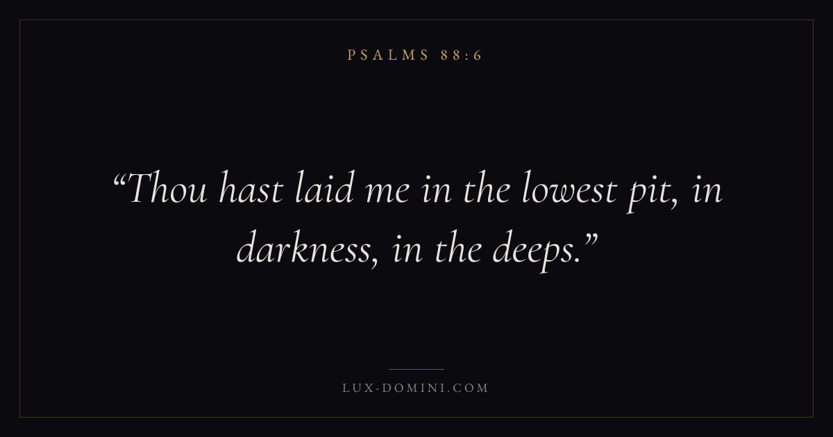 Books / Psalms / Chapter 88 / Verse 6 ← Psalms 88:5 Psalms 88:6 Psalms 88:7 → Thou hast laid me in the lowest pit, in darkness, in the deeps. Download verse card Share on Twitter Share on Facebook Pin it ✦ Key themes FaithSuffering and trialsPrayerPraise Read with Hebrews 11:1Romans 10:17Romans 8:182 Corinthians 4:17 Related topics Bible verses about faithBible verses about suffering and trialsBible verses about prayerBible verses about thankfulness and gratitude ✦ Psalms Chapter 88 verses V. 1 V. 2 V. 3 V. 4 V. 5 V. 6 V. 7 V. 8 V. 9 V. 10 V. 11 V. 12 V. 13 V. 14 V. 15 V. 16 V. 17 V. 18
