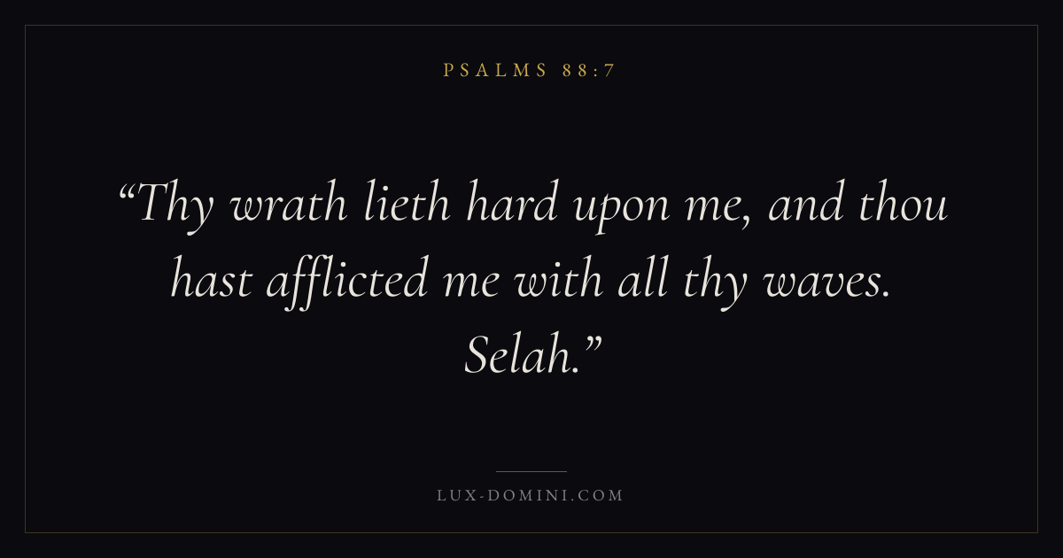 Books / Psalms / Chapter 88 / Verse 7 ← Psalms 88:6 Psalms 88:7 Psalms 88:8 → Thy wrath lieth hard upon me, and thou hast afflicted me with all thy waves. Selah. Download verse card Share on Twitter Share on Facebook Pin it ✦ Key themes FaithSuffering and trialsPrayerPraise Read with Hebrews 11:1Romans 10:17Romans 8:182 Corinthians 4:17 Related topics Bible verses about faithBible verses about suffering and trialsBible verses about prayerBible verses about thankfulness and gratitude ✦ Psalms Chapter 88 verses V. 1 V. 2 V. 3 V. 4 V. 5 V. 6 V. 7 V. 8 V. 9 V. 10 V. 11 V. 12 V. 13 V. 14 V. 15 V. 16 V. 17 V. 18