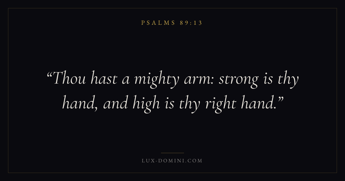 Books / Psalms / Chapter 89 / Verse 13 ← Psalms 89:12 Psalms 89:13 Psalms 89:14 → Thou hast a mighty arm: strong is thy hand, and high is thy right hand. Download verse card Share on Twitter Share on Facebook Pin it ✦ Key themes FaithPrayerPraiseLament Read with Hebrews 11:1Romans 10:17Matthew 6:9Luke 18:1 Related topics Bible verses about faithBible verses about prayerBible verses about thankfulness and gratitudeBible verses about grief and loss ✦ Psalms Chapter 89 verses V. 1 V. 2 V. 3 V. 4 V. 5 V. 6 V. 7 V. 8 V. 9 V. 10 V. 11 V. 12 V. 13 V. 14 V. 15 V. 16 V. 17 V. 18 V. 19 V. 20 V. 21 V. 22 V. 23 V. 24 V. 25 V. 26 V. 27 V. 28 V. 29 V. 30 V. 31 V. 32 V. 33 V. 34 V. 35 V. 36 V. 37 V. 38 V. 39 V. 40 V. 41 V. 42 V. 43 V. 44 V. 45 V. 46 V. 47 V. 48 V. 49 V. 50 V. 51 V. 52