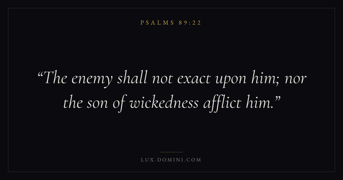 Books / Psalms / Chapter 89 / Verse 22 ← Psalms 89:21 Psalms 89:22 Psalms 89:23 → The enemy shall not exact upon him; nor the son of wickedness afflict him. Download verse card Share on Twitter Share on Facebook Pin it ✦ Key themes FaithPrayerPraiseLament Read with Hebrews 11:1Romans 10:17Matthew 6:9Luke 18:1 Related topics Bible verses about faithBible verses about prayerBible verses about thankfulness and gratitudeBible verses about grief and loss ✦ Psalms Chapter 89 verses V. 1 V. 2 V. 3 V. 4 V. 5 V. 6 V. 7 V. 8 V. 9 V. 10 V. 11 V. 12 V. 13 V. 14 V. 15 V. 16 V. 17 V. 18 V. 19 V. 20 V. 21 V. 22 V. 23 V. 24 V. 25 V. 26 V. 27 V. 28 V. 29 V. 30 V. 31 V. 32 V. 33 V. 34 V. 35 V. 36 V. 37 V. 38 V. 39 V. 40 V. 41 V. 42 V. 43 V. 44 V. 45 V. 46 V. 47 V. 48 V. 49 V. 50 V. 51 V. 52