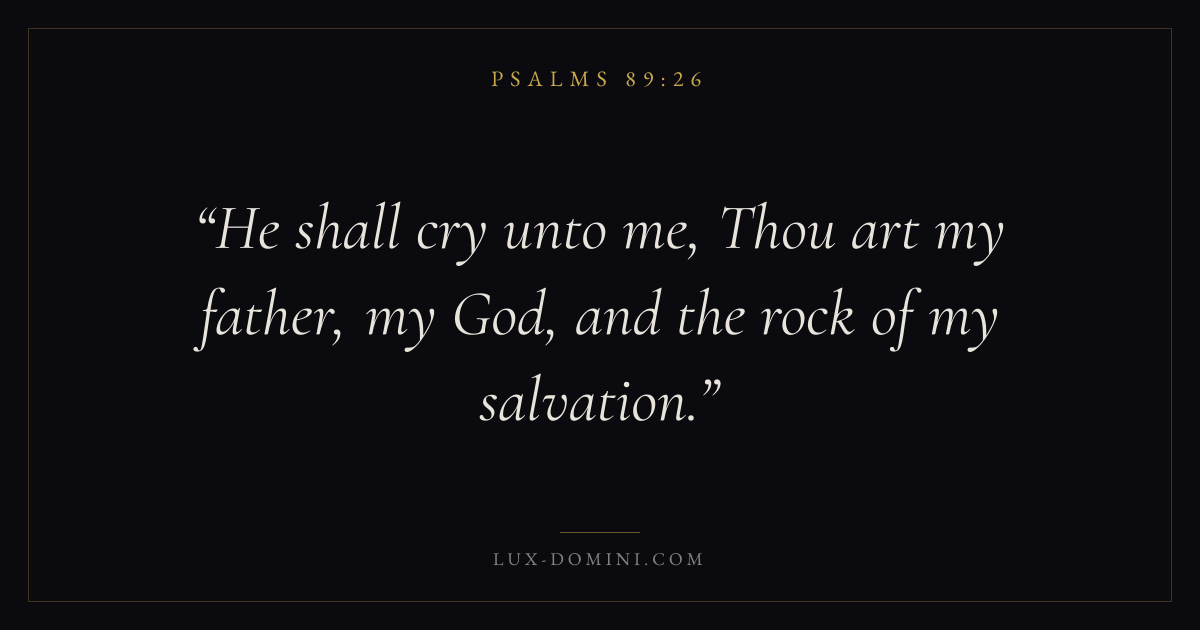 Books / Psalms / Chapter 89 / Verse 26 ← Psalms 89:25 Psalms 89:26 Psalms 89:27 → He shall cry unto me, Thou art my father, my God, and the rock of my salvation. Download verse card Share on Twitter Share on Facebook Pin it ✦ Key themes FaithPrayerSalvationPraise Read with Hebrews 11:1Romans 10:17Matthew 6:9Luke 18:1 Related topics Bible verses about faithBible verses about prayerBible verses about salvationBible verses about thankfulness and gratitude ✦ Psalms Chapter 89 verses V. 1 V. 2 V. 3 V. 4 V. 5 V. 6 V. 7 V. 8 V. 9 V. 10 V. 11 V. 12 V. 13 V. 14 V. 15 V. 16 V. 17 V. 18 V. 19 V. 20 V. 21 V. 22 V. 23 V. 24 V. 25 V. 26 V. 27 V. 28 V. 29 V. 30 V. 31 V. 32 V. 33 V. 34 V. 35 V. 36 V. 37 V. 38 V. 39 V. 40 V. 41 V. 42 V. 43 V. 44 V. 45 V. 46 V. 47 V. 48 V. 49 V. 50 V. 51 V. 52