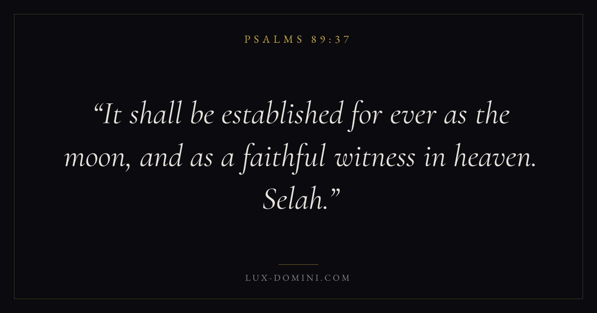 Books / Psalms / Chapter 89 / Verse 37 ← Psalms 89:36 Psalms 89:37 Psalms 89:38 → It shall be established for ever as the moon, and as a faithful witness in heaven. Selah. Download verse card Share on Twitter Share on Facebook Pin it ✦ Key themes FaithPrayerTruthPraise Read with Hebrews 11:1Romans 10:17Matthew 6:9Luke 18:1 Related topics Bible verses about faithBible verses about prayerBible verses about truthBible verses about thankfulness and gratitude ✦ Psalms Chapter 89 verses V. 1 V. 2 V. 3 V. 4 V. 5 V. 6 V. 7 V. 8 V. 9 V. 10 V. 11 V. 12 V. 13 V. 14 V. 15 V. 16 V. 17 V. 18 V. 19 V. 20 V. 21 V. 22 V. 23 V. 24 V. 25 V. 26 V. 27 V. 28 V. 29 V. 30 V. 31 V. 32 V. 33 V. 34 V. 35 V. 36 V. 37 V. 38 V. 39 V. 40 V. 41 V. 42 V. 43 V. 44 V. 45 V. 46 V. 47 V. 48 V. 49 V. 50 V. 51 V. 52