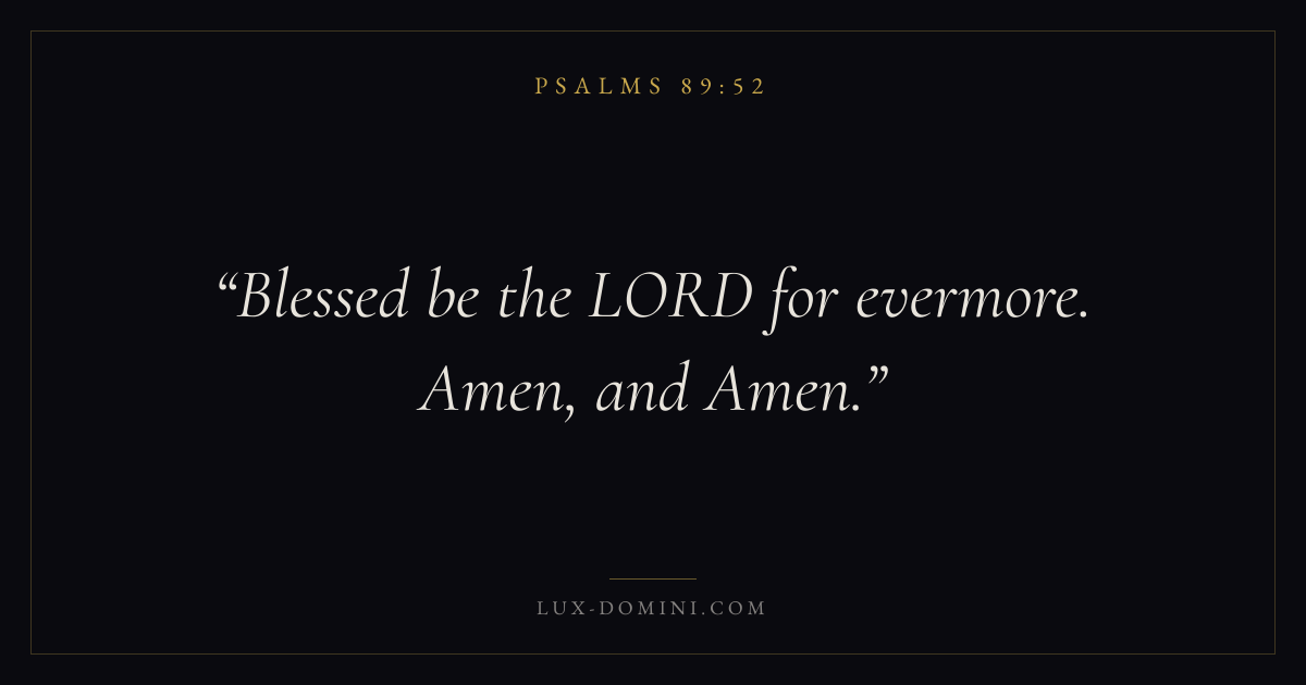 Books / Psalms / Chapter 89 / Verse 52 ← Psalms 89:51 Psalms 89:52 Psalms 90:1 → Blessed be the LORD for evermore. Amen, and Amen. Download verse card Share on Twitter Share on Facebook Pin it ✦ Key themes FaithPrayerTruthPraise Read with Hebrews 11:1Romans 10:17Matthew 6:9Luke 18:1 Related topics Bible verses about faithBible verses about prayerBible verses about truthBible verses about thankfulness and gratitude ✦ Psalms Chapter 89 verses V. 1 V. 2 V. 3 V. 4 V. 5 V. 6 V. 7 V. 8 V. 9 V. 10 V. 11 V. 12 V. 13 V. 14 V. 15 V. 16 V. 17 V. 18 V. 19 V. 20 V. 21 V. 22 V. 23 V. 24 V. 25 V. 26 V. 27 V. 28 V. 29 V. 30 V. 31 V. 32 V. 33 V. 34 V. 35 V. 36 V. 37 V. 38 V. 39 V. 40 V. 41 V. 42 V. 43 V. 44 V. 45 V. 46 V. 47 V. 48 V. 49 V. 50 V. 51 V. 52