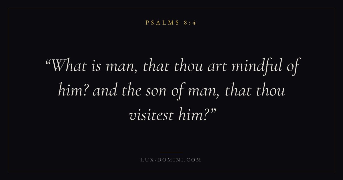 Books / Psalms / Chapter 8 / Verse 4 ← Psalms 8:3 Psalms 8:4 Psalms 8:5 → What is man, that thou art mindful of him? and the son of man, that thou visitest him? Download verse card Share on Twitter Share on Facebook Pin it ✦ Key themes FaithPrayerPraiseLament Read with Hebrews 11:1Romans 10:17Matthew 6:9Luke 18:1 Related topics Bible verses about faithBible verses about prayerBible verses about thankfulness and gratitudeBible verses about grief and loss ✦ Psalms Chapter 8 verses V. 1 V. 2 V. 3 V. 4 V. 5 V. 6 V. 7 V. 8 V. 9