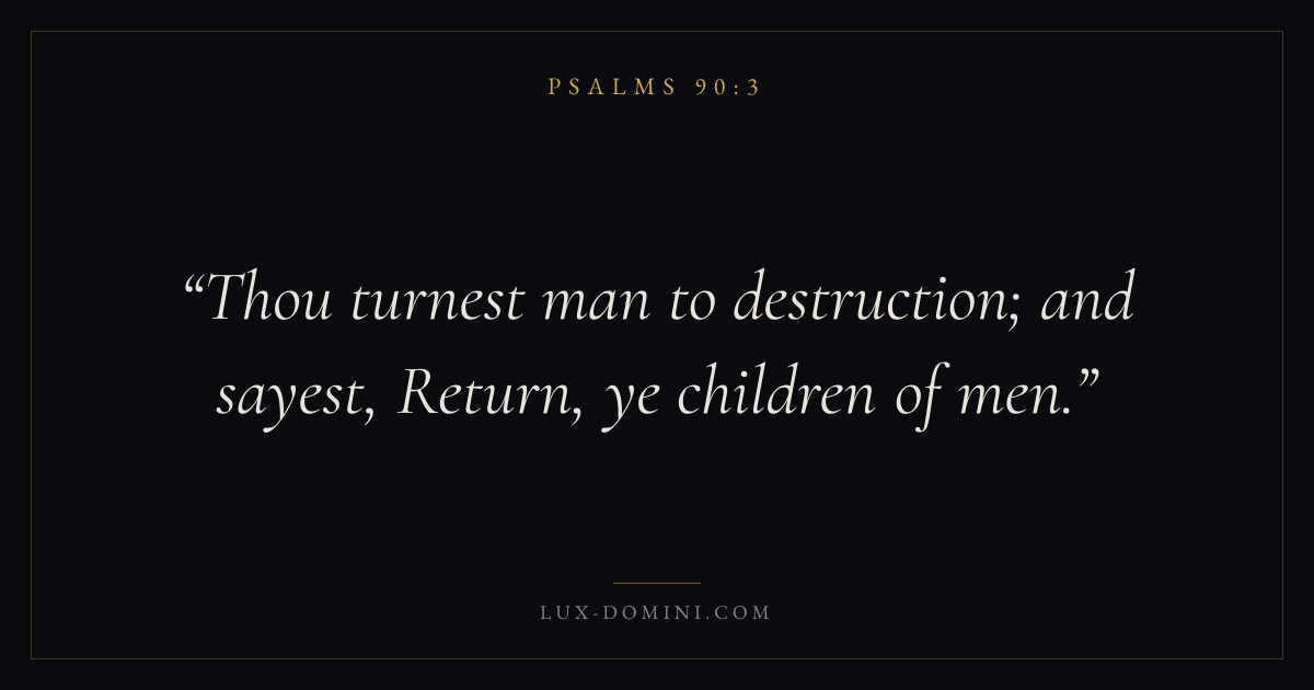 Books / Psalms / Chapter 90 / Verse 3 ← Psalms 90:2 Psalms 90:3 Psalms 90:4 → Thou turnest man to destruction; and sayest, Return, ye children of men. Download verse card Share on Twitter Share on Facebook Pin it ✦ Key themes FaithPrayerPeacePraise Read with Hebrews 11:1Romans 10:17Matthew 6:9Luke 18:1 Related topics Bible verses about faithBible verses about prayerBible verses about peaceBible verses about thankfulness and gratitude ✦ Psalms Chapter 90 verses V. 1 V. 2 V. 3 V. 4 V. 5 V. 6 V. 7 V. 8 V. 9 V. 10 V. 11 V. 12 V. 13 V. 14 V. 15 V. 16 V. 17