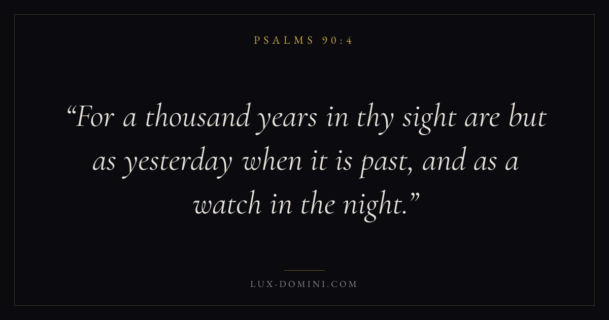 Books / Psalms / Chapter 90 / Verse 4 ← Psalms 90:3 Psalms 90:4 Psalms 90:5 → For a thousand years in thy sight are but as yesterday when it is past, and as a watch in the night. Download verse card Share on Twitter Share on Facebook Pin it ✦ Key themes FaithPrayerPeacePraise Read with Hebrews 11:1Romans 10:17Matthew 6:9Luke 18:1 Related topics Bible verses about faithBible verses about prayerBible verses about peaceBible verses about thankfulness and gratitude ✦ Psalms Chapter 90 verses V. 1 V. 2 V. 3 V. 4 V. 5 V. 6 V. 7 V. 8 V. 9 V. 10 V. 11 V. 12 V. 13 V. 14 V. 15 V. 16 V. 17