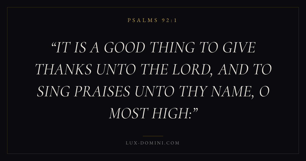 Books / Psalms / Chapter 92 / Verse 1 ← Psalms 91:16 Psalms 92:1 Psalms 92:2 → IT IS A GOOD THING TO GIVE THANKS UNTO THE LORD, AND TO SING PRAISES UNTO THY NAME, O MOST HIGH: Download verse card Share on Twitter Share on Facebook Pin it ✦ Key themes FaithHopePrayerPraise Read with Hebrews 11:1Romans 10:17Romans 8:24Revelation 21:4 Related topics Bible verses about faithBible verses about hopeBible verses about prayerBible verses about thankfulness and gratitude ✦ Psalms Chapter 92 verses V. 1 V. 2 V. 3 V. 4 V. 5 V. 6 V. 7 V. 8 V. 9 V. 10 V. 11 V. 12 V. 13 V. 14 V. 15
