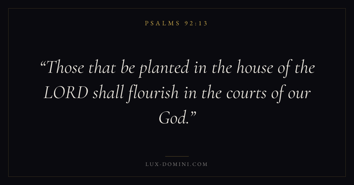 Books / Psalms / Chapter 92 / Verse 13 ← Psalms 92:12 Psalms 92:13 Psalms 92:14 → Those that be planted in the house of the LORD shall flourish in the courts of our God. Download verse card Share on Twitter Share on Facebook Pin it ✦ Key themes FaithPrayerSalvationGracePraise Read with Hebrews 11:1Romans 10:17Matthew 6:9Luke 18:1 Related topics Bible verses about faithBible verses about prayerBible verses about salvationBible verses about graceBible verses about thankfulness and gratitude ✦ Psalms Chapter 92 verses V. 1 V. 2 V. 3 V. 4 V. 5 V. 6 V. 7 V. 8 V. 9 V. 10 V. 11 V. 12 V. 13 V. 14 V. 15