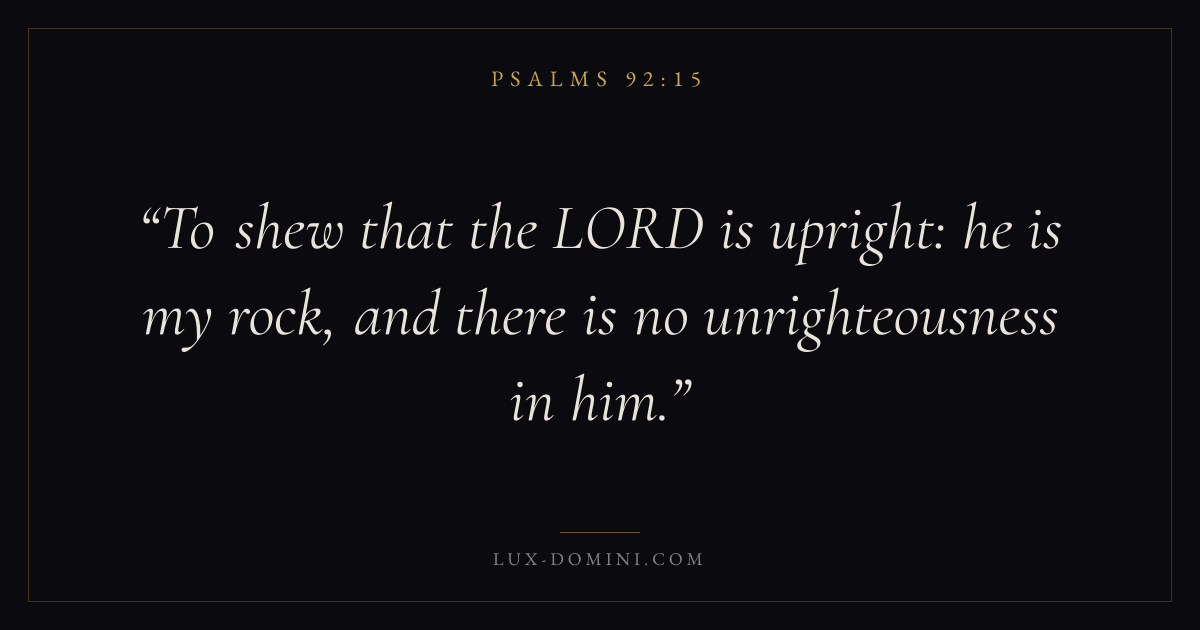 Books / Psalms / Chapter 92 / Verse 15 ← Psalms 92:14 Psalms 92:15 Psalms 93:1 → To shew that the LORD is upright: he is my rock, and there is no unrighteousness in him. Download verse card Share on Twitter Share on Facebook Pin it ✦ Key themes FaithPrayerSalvationGracePraise Read with Hebrews 11:1Romans 10:17Matthew 6:9Luke 18:1 Related topics Bible verses about faithBible verses about prayerBible verses about salvationBible verses about graceBible verses about thankfulness and gratitude ✦ Psalms Chapter 92 verses V. 1 V. 2 V. 3 V. 4 V. 5 V. 6 V. 7 V. 8 V. 9 V. 10 V. 11 V. 12 V. 13 V. 14 V. 15