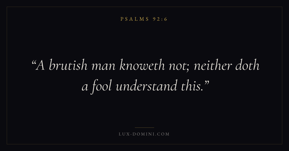 Books / Psalms / Chapter 92 / Verse 6 ← Psalms 92:5 Psalms 92:6 Psalms 92:7 → A brutish man knoweth not; neither doth a fool understand this. Download verse card Share on Twitter Share on Facebook Pin it ✦ Key themes FaithHopePrayerPraise Read with Hebrews 11:1Romans 10:17Romans 8:24Revelation 21:4 Related topics Bible verses about faithBible verses about hopeBible verses about prayerBible verses about thankfulness and gratitude ✦ Psalms Chapter 92 verses V. 1 V. 2 V. 3 V. 4 V. 5 V. 6 V. 7 V. 8 V. 9 V. 10 V. 11 V. 12 V. 13 V. 14 V. 15