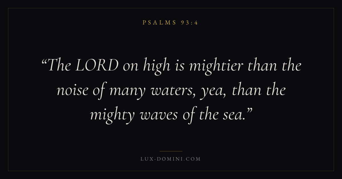 Books / Psalms / Chapter 93 / Verse 4 ← Psalms 93:3 Psalms 93:4 Psalms 93:5 → The LORD on high is mightier than the noise of many waters, yea, than the mighty waves of the sea. Download verse card Share on Twitter Share on Facebook Pin it ✦ Key themes FaithPrayerPraiseLament Read with Hebrews 11:1Romans 10:17Matthew 6:9Luke 18:1 Related topics Bible verses about faithBible verses about prayerBible verses about thankfulness and gratitudeBible verses about grief and loss ✦ Psalms Chapter 93 verses V. 1 V. 2 V. 3 V. 4 V. 5