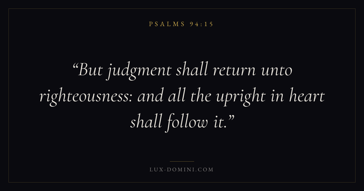 Books / Psalms / Chapter 94 / Verse 15 ← Psalms 94:14 Psalms 94:15 Psalms 94:16 → But judgment shall return unto righteousness: and all the upright in heart shall follow it. Download verse card Share on Twitter Share on Facebook Pin it ✦ Key themes FaithPrayerJustice and mercyTruthPraise Read with Hebrews 11:1Romans 10:17Matthew 6:9Luke 18:1 Related topics Bible verses about faithBible verses about prayerBible verses about justice and mercyBible verses about truthBible verses about thankfulness and gratitude ✦ Psalms Chapter 94 verses V. 1 V. 2 V. 3 V. 4 V. 5 V. 6 V. 7 V. 8 V. 9 V. 10 V. 11 V. 12 V. 13 V. 14 V. 15 V. 16 V. 17 V. 18 V. 19 V. 20 V. 21 V. 22 V. 23