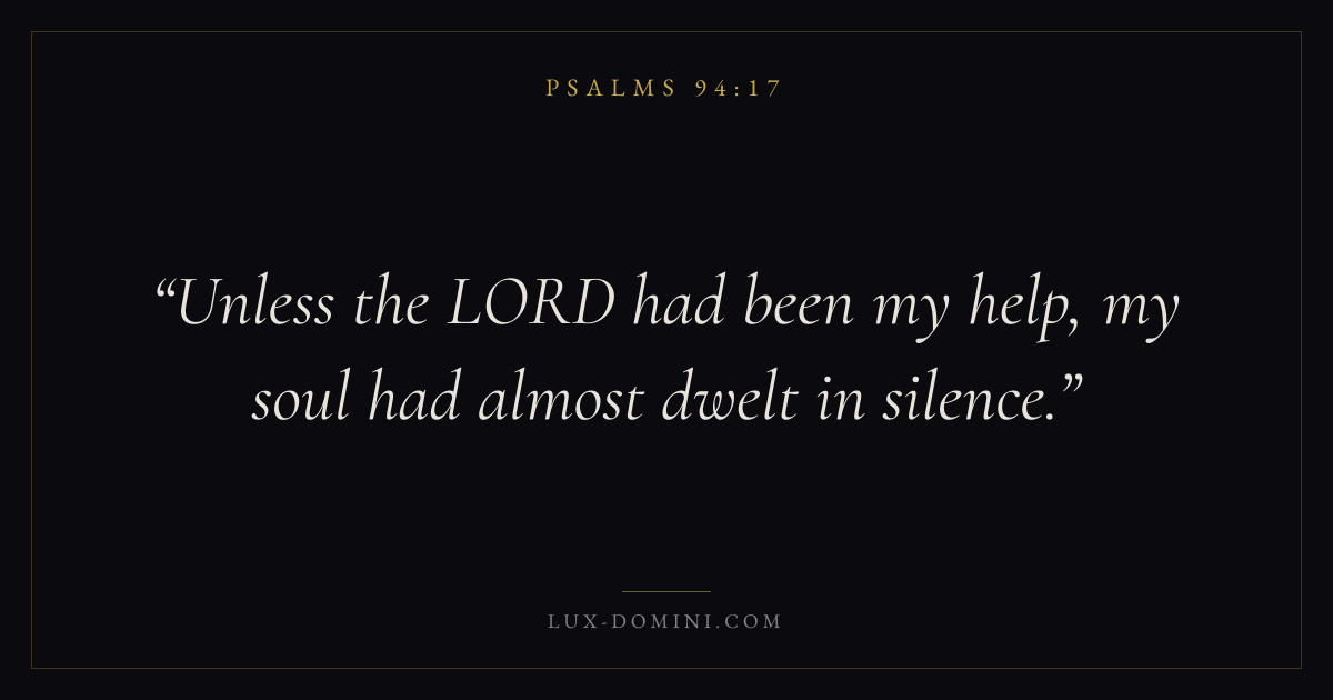 Books / Psalms / Chapter 94 / Verse 17 ← Psalms 94:16 Psalms 94:17 Psalms 94:18 → Unless the LORD had been my help, my soul had almost dwelt in silence. Download verse card Share on Twitter Share on Facebook Pin it ✦ Key themes FaithPrayerJustice and mercyTruthPraise Read with Hebrews 11:1Romans 10:17Matthew 6:9Luke 18:1 Related topics Bible verses about faithBible verses about prayerBible verses about justice and mercyBible verses about truthBible verses about thankfulness and gratitude ✦ Psalms Chapter 94 verses V. 1 V. 2 V. 3 V. 4 V. 5 V. 6 V. 7 V. 8 V. 9 V. 10 V. 11 V. 12 V. 13 V. 14 V. 15 V. 16 V. 17 V. 18 V. 19 V. 20 V. 21 V. 22 V. 23