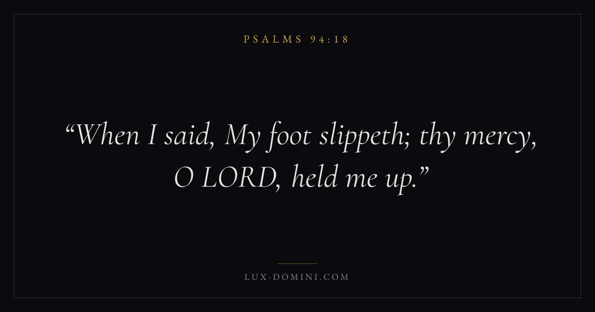 Books / Psalms / Chapter 94 / Verse 18 ← Psalms 94:17 Psalms 94:18 Psalms 94:19 → When I said, My foot slippeth; thy mercy, O LORD, held me up. Download verse card Share on Twitter Share on Facebook Pin it ✦ Key themes FaithPrayerJustice and mercyTruthPraise Read with Hebrews 11:1Romans 10:17Matthew 6:9Luke 18:1 Related topics Bible verses about faithBible verses about prayerBible verses about justice and mercyBible verses about truthBible verses about thankfulness and gratitude ✦ Psalms Chapter 94 verses V. 1 V. 2 V. 3 V. 4 V. 5 V. 6 V. 7 V. 8 V. 9 V. 10 V. 11 V. 12 V. 13 V. 14 V. 15 V. 16 V. 17 V. 18 V. 19 V. 20 V. 21 V. 22 V. 23