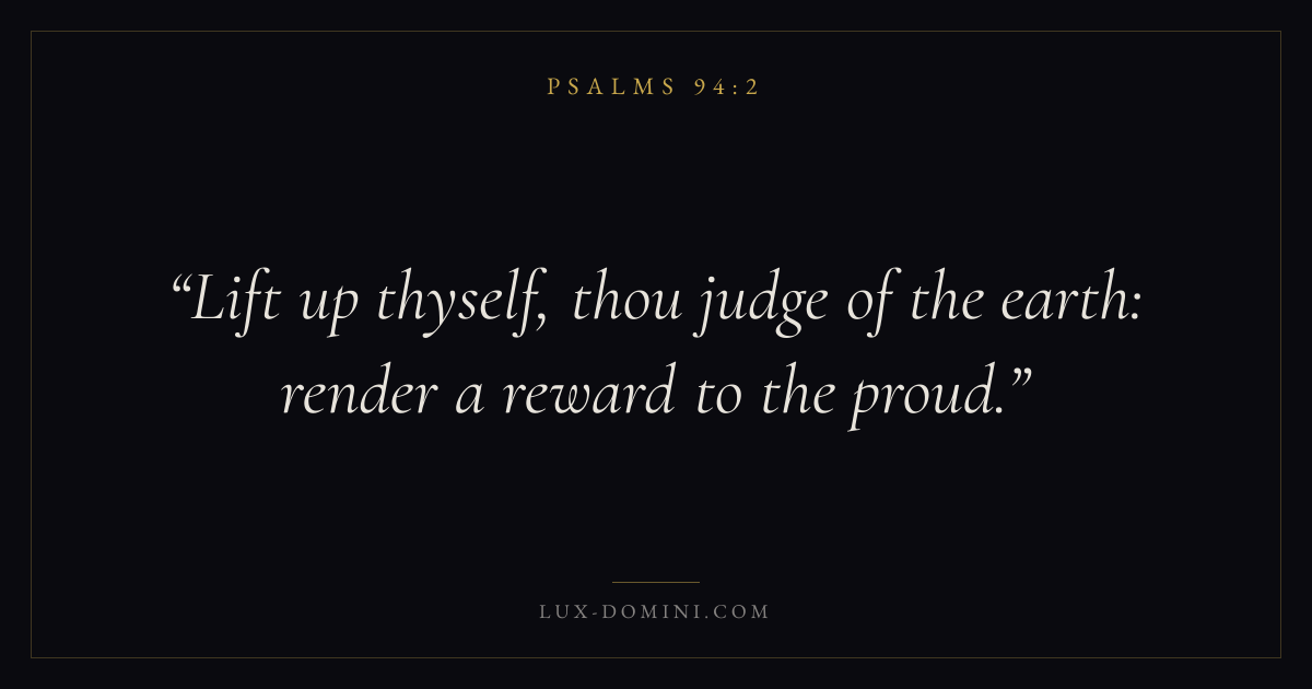 Books / Psalms / Chapter 94 / Verse 2 ← Psalms 94:1 Psalms 94:2 Psalms 94:3 → Lift up thyself, thou judge of the earth: render a reward to the proud. Download verse card Share on Twitter Share on Facebook Pin it ✦ Key themes FaithSuffering and trialsPrayerJustice and mercyPraise Read with Hebrews 11:1Romans 10:17Romans 8:182 Corinthians 4:17 Related topics Bible verses about faithBible verses about suffering and trialsBible verses about prayerBible verses about justice and mercyBible verses about thankfulness and gratitude ✦ Psalms Chapter 94 verses V. 1 V. 2 V. 3 V. 4 V. 5 V. 6 V. 7 V. 8 V. 9 V. 10 V. 11 V. 12 V. 13 V. 14 V. 15 V. 16 V. 17 V. 18 V. 19 V. 20 V. 21 V. 22 V. 23