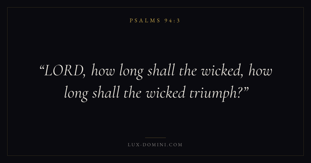 Books / Psalms / Chapter 94 / Verse 3 ← Psalms 94:2 Psalms 94:3 Psalms 94:4 → LORD, how long shall the wicked, how long shall the wicked triumph? Download verse card Share on Twitter Share on Facebook Pin it ✦ Key themes FaithSuffering and trialsPrayerJustice and mercyPraise Read with Hebrews 11:1Romans 10:17Romans 8:182 Corinthians 4:17 Related topics Bible verses about faithBible verses about suffering and trialsBible verses about prayerBible verses about justice and mercyBible verses about thankfulness and gratitude ✦ Psalms Chapter 94 verses V. 1 V. 2 V. 3 V. 4 V. 5 V. 6 V. 7 V. 8 V. 9 V. 10 V. 11 V. 12 V. 13 V. 14 V. 15 V. 16 V. 17 V. 18 V. 19 V. 20 V. 21 V. 22 V. 23