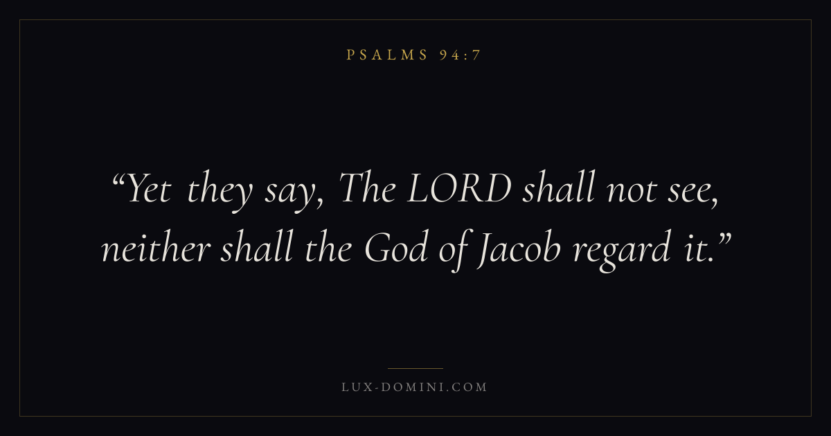 Books / Psalms / Chapter 94 / Verse 7 ← Psalms 94:6 Psalms 94:7 Psalms 94:8 → Yet they say, The LORD shall not see, neither shall the God of Jacob regard it. Download verse card Share on Twitter Share on Facebook Pin it ✦ Key themes FaithSuffering and trialsPrayerJustice and mercyPraise Read with Hebrews 11:1Romans 10:17Romans 8:182 Corinthians 4:17 Related topics Bible verses about faithBible verses about suffering and trialsBible verses about prayerBible verses about justice and mercyBible verses about thankfulness and gratitude ✦ Psalms Chapter 94 verses V. 1 V. 2 V. 3 V. 4 V. 5 V. 6 V. 7 V. 8 V. 9 V. 10 V. 11 V. 12 V. 13 V. 14 V. 15 V. 16 V. 17 V. 18 V. 19 V. 20 V. 21 V. 22 V. 23