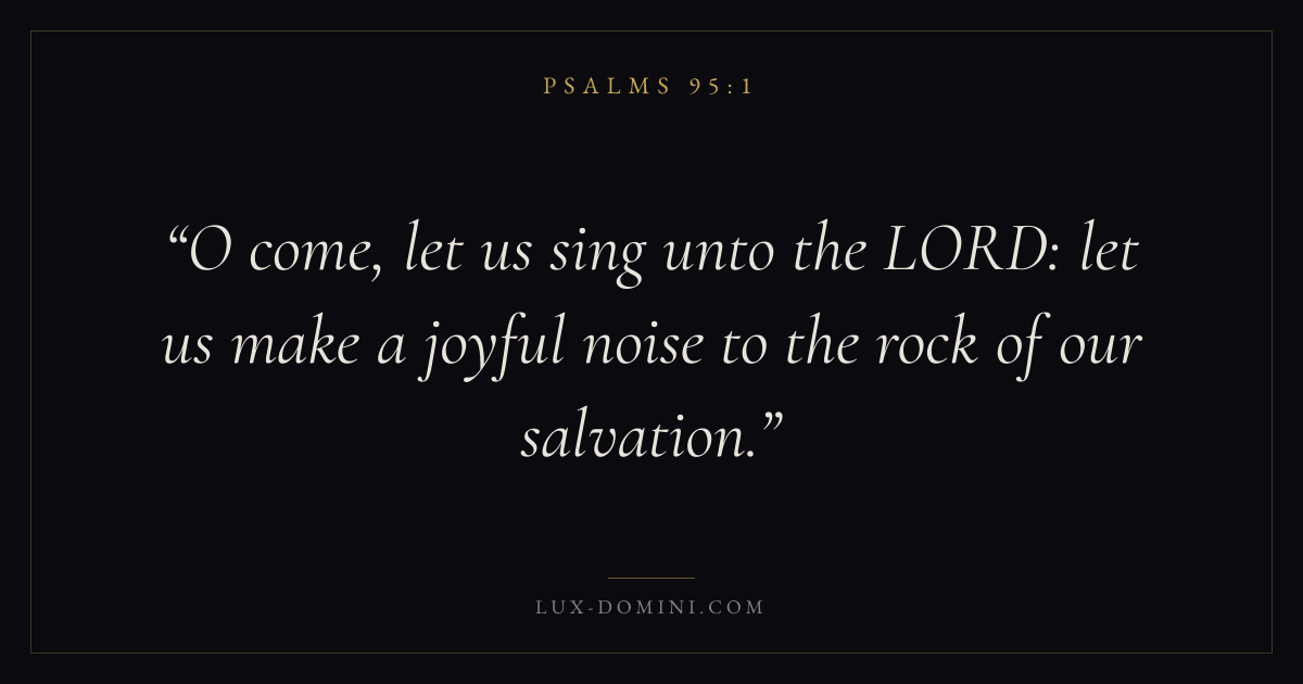 Books / Psalms / Chapter 95 / Verse 1 ← Psalms 94:23 Psalms 95:1 Psalms 95:2 → O come, let us sing unto the LORD: let us make a joyful noise to the rock of our salvation. Download verse card Share on Twitter Share on Facebook Pin it ✦ Key themes FaithPrayerSalvationPraise Read with Hebrews 11:1Romans 10:17Matthew 6:9Luke 18:1 Related topics Bible verses about faithBible verses about prayerBible verses about salvationBible verses about thankfulness and gratitude ✦ Psalms Chapter 95 verses V. 1 V. 2 V. 3 V. 4 V. 5 V. 6 V. 7 V. 8 V. 9 V. 10 V. 11