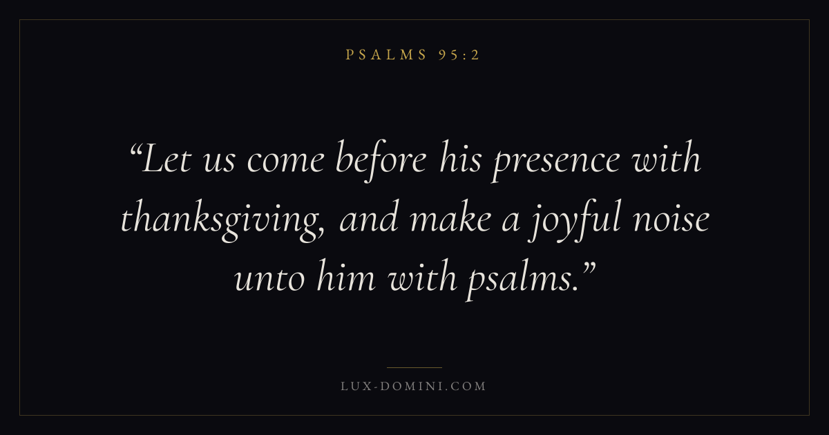 Books / Psalms / Chapter 95 / Verse 2 ← Psalms 95:1 Psalms 95:2 Psalms 95:3 → Let us come before his presence with thanksgiving, and make a joyful noise unto him with psalms. Download verse card Share on Twitter Share on Facebook Pin it ✦ Key themes FaithPrayerPraiseLament Read with Hebrews 11:1Romans 10:17Matthew 6:9Luke 18:1 Related topics Bible verses about faithBible verses about prayerBible verses about thankfulness and gratitudeBible verses about grief and loss ✦ Psalms Chapter 95 verses V. 1 V. 2 V. 3 V. 4 V. 5 V. 6 V. 7 V. 8 V. 9 V. 10 V. 11