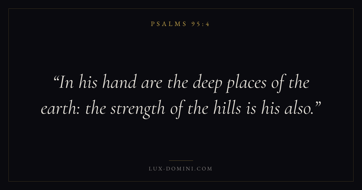 Books / Psalms / Chapter 95 / Verse 4 ← Psalms 95:3 Psalms 95:4 Psalms 95:5 → In his hand are the deep places of the earth: the strength of the hills is his also. Download verse card Share on Twitter Share on Facebook Pin it ✦ Key themes FaithPrayerPraiseLament Read with Hebrews 11:1Romans 10:17Matthew 6:9Luke 18:1 Related topics Bible verses about faithBible verses about prayerBible verses about thankfulness and gratitudeBible verses about grief and loss ✦ Psalms Chapter 95 verses V. 1 V. 2 V. 3 V. 4 V. 5 V. 6 V. 7 V. 8 V. 9 V. 10 V. 11