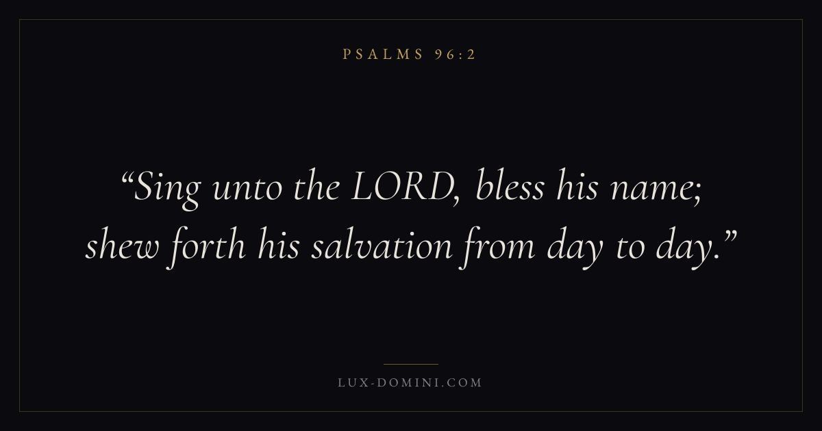 Books / Psalms / Chapter 96 / Verse 2 ← Psalms 96:1 Psalms 96:2 Psalms 96:3 → Sing unto the LORD, bless his name; shew forth his salvation from day to day. Download verse card Share on Twitter Share on Facebook Pin it ✦ Key themes FaithPrayerSalvationPraise Read with Hebrews 11:1Romans 10:17Matthew 6:9Luke 18:1 Related topics Bible verses about faithBible verses about prayerBible verses about salvationBible verses about thankfulness and gratitude ✦ Psalms Chapter 96 verses V. 1 V. 2 V. 3 V. 4 V. 5 V. 6 V. 7 V. 8 V. 9 V. 10 V. 11 V. 12 V. 13