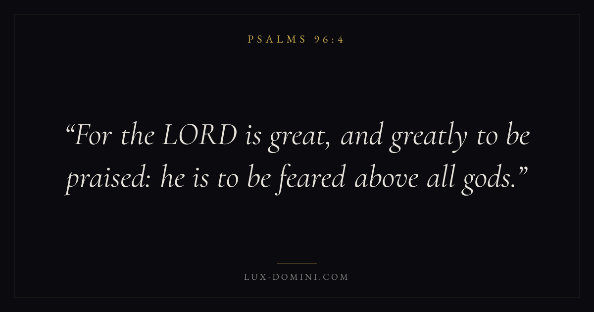 Books / Psalms / Chapter 96 / Verse 4 ← Psalms 96:3 Psalms 96:4 Psalms 96:5 → For the LORD is great, and greatly to be praised: he is to be feared above all gods. Download verse card Share on Twitter Share on Facebook Pin it ✦ Key themes FaithPrayerSalvationPraise Read with Hebrews 11:1Romans 10:17Matthew 6:9Luke 18:1 Related topics Bible verses about faithBible verses about prayerBible verses about salvationBible verses about thankfulness and gratitude ✦ Psalms Chapter 96 verses V. 1 V. 2 V. 3 V. 4 V. 5 V. 6 V. 7 V. 8 V. 9 V. 10 V. 11 V. 12 V. 13