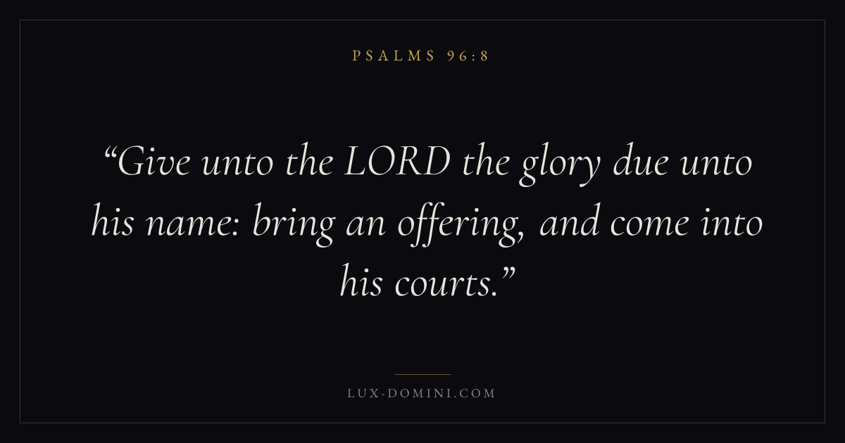Books / Psalms / Chapter 96 / Verse 8 ← Psalms 96:7 Psalms 96:8 Psalms 96:9 → Give unto the LORD the glory due unto his name: bring an offering, and come into his courts. Download verse card Share on Twitter Share on Facebook Pin it ✦ Key themes FaithPrayerSalvationPraise Read with Hebrews 11:1Romans 10:17Matthew 6:9Luke 18:1 Related topics Bible verses about faithBible verses about prayerBible verses about salvationBible verses about thankfulness and gratitude ✦ Psalms Chapter 96 verses V. 1 V. 2 V. 3 V. 4 V. 5 V. 6 V. 7 V. 8 V. 9 V. 10 V. 11 V. 12 V. 13