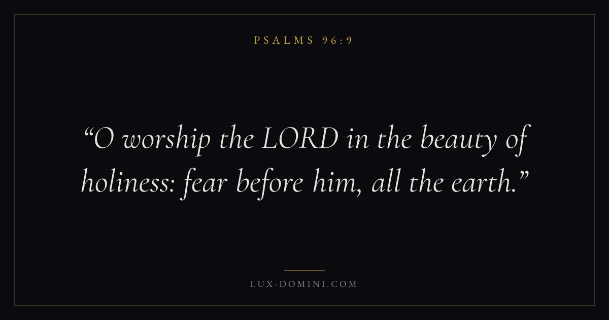 Books / Psalms / Chapter 96 / Verse 9 ← Psalms 96:8 Psalms 96:9 Psalms 96:10 → O worship the LORD in the beauty of holiness: fear before him, all the earth. Download verse card Share on Twitter Share on Facebook Pin it ✦ Key themes FaithAnxiety and fearPrayerSalvationPraise Read with Hebrews 11:1Romans 10:17Philippians 4:6Isaiah 41:10 Related topics Bible verses about faithBible verses about anxiety and fearBible verses about prayerBible verses about salvationBible verses about thankfulness and gratitude ✦ Psalms Chapter 96 verses V. 1 V. 2 V. 3 V. 4 V. 5 V. 6 V. 7 V. 8 V. 9 V. 10 V. 11 V. 12 V. 13
