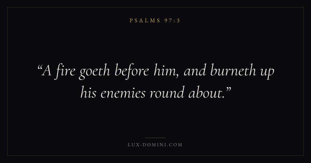 Books / Psalms / Chapter 97 / Verse 3 ← Psalms 97:2 Psalms 97:3 Psalms 97:4 → A fire goeth before him, and burneth up his enemies round about. Download verse card Share on Twitter Share on Facebook Pin it ✦ Key themes FaithPrayerPeacePraise Read with Hebrews 11:1Romans 10:17Matthew 6:9Luke 18:1 Related topics Bible verses about faithBible verses about prayerBible verses about peaceBible verses about thankfulness and gratitude ✦ Psalms Chapter 97 verses V. 1 V. 2 V. 3 V. 4 V. 5 V. 6 V. 7 V. 8 V. 9 V. 10 V. 11 V. 12