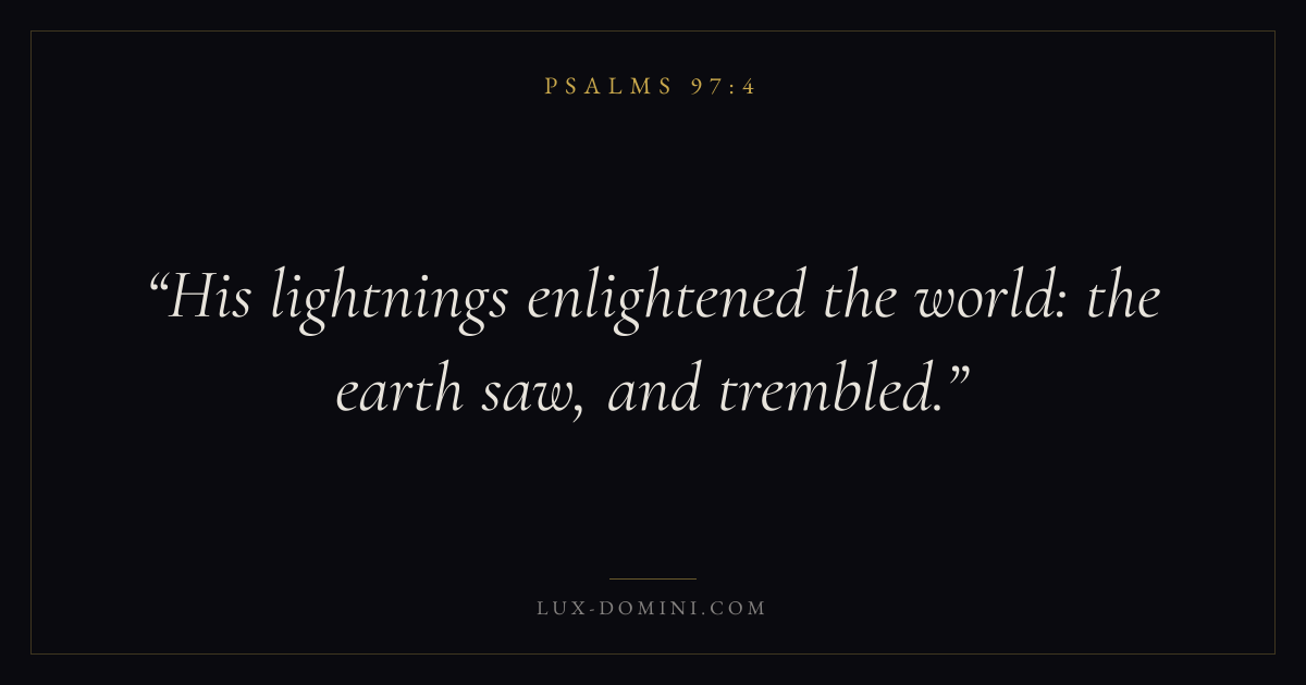 Books / Psalms / Chapter 97 / Verse 4 ← Psalms 97:3 Psalms 97:4 Psalms 97:5 → His lightnings enlightened the world: the earth saw, and trembled. Download verse card Share on Twitter Share on Facebook Pin it ✦ Key themes FaithPrayerPeacePraise Read with Hebrews 11:1Romans 10:17Matthew 6:9Luke 18:1 Related topics Bible verses about faithBible verses about prayerBible verses about peaceBible verses about thankfulness and gratitude ✦ Psalms Chapter 97 verses V. 1 V. 2 V. 3 V. 4 V. 5 V. 6 V. 7 V. 8 V. 9 V. 10 V. 11 V. 12