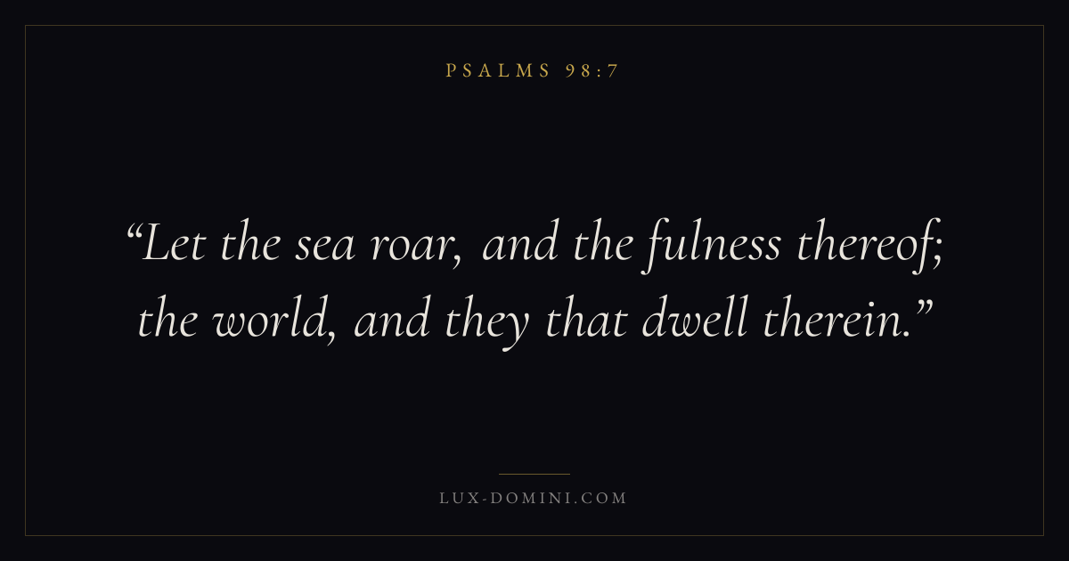 Books / Psalms / Chapter 98 / Verse 7 ← Psalms 98:6 Psalms 98:7 Psalms 98:8 → Let the sea roar, and the fulness thereof; the world, and they that dwell therein. Download verse card Share on Twitter Share on Facebook Pin it ✦ Key themes FaithPrayerPraiseLament Read with Hebrews 11:1Romans 10:17Matthew 6:9Luke 18:1 Related topics Bible verses about faithBible verses about prayerBible verses about thankfulness and gratitudeBible verses about grief and loss ✦ Psalms Chapter 98 verses V. 1 V. 2 V. 3 V. 4 V. 5 V. 6 V. 7 V. 8 V. 9