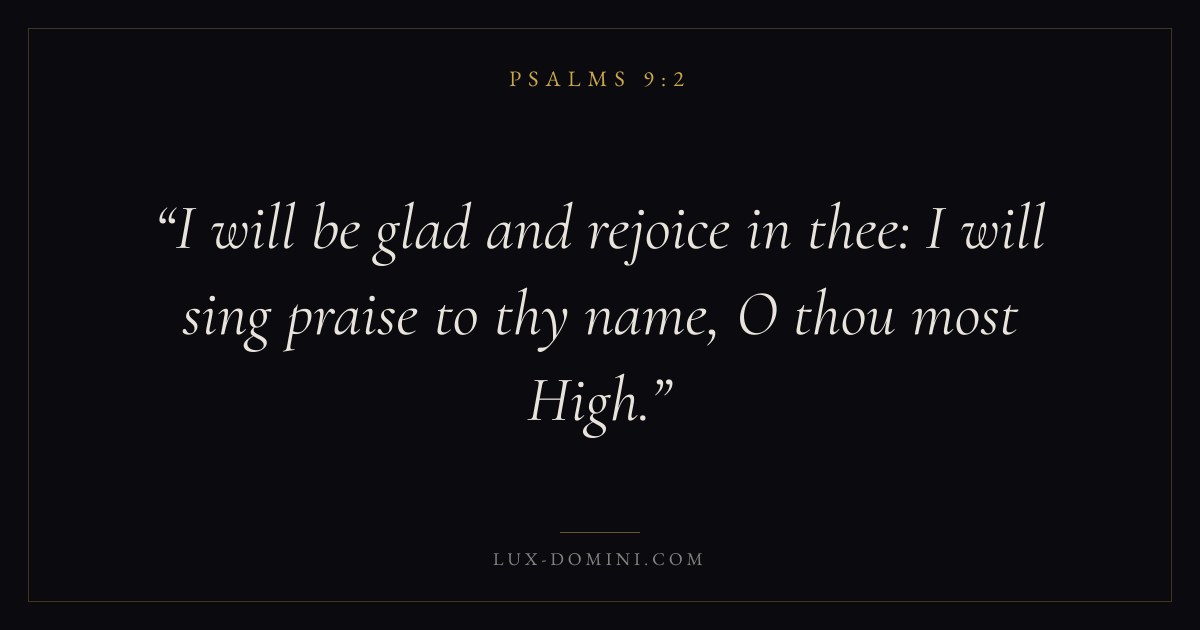 Books / Psalms / Chapter 9 / Verse 2 ← Psalms 9:1 Psalms 9:2 Psalms 9:3 → I will be glad and rejoice in thee: I will sing praise to thy name, O thou most High. Download verse card Share on Twitter Share on Facebook Pin it ✦ Key themes FaithPrayerJustice and mercyPraise Read with Hebrews 11:1Romans 10:17Matthew 6:9Luke 18:1 Related topics Bible verses about faithBible verses about prayerBible verses about justice and mercyBible verses about thankfulness and gratitude ✦ Psalms Chapter 9 verses V. 1 V. 2 V. 3 V. 4 V. 5 V. 6 V. 7 V. 8 V. 9 V. 10 V. 11 V. 12 V. 13 V. 14 V. 15 V. 16 V. 17 V. 18 V. 19 V. 20