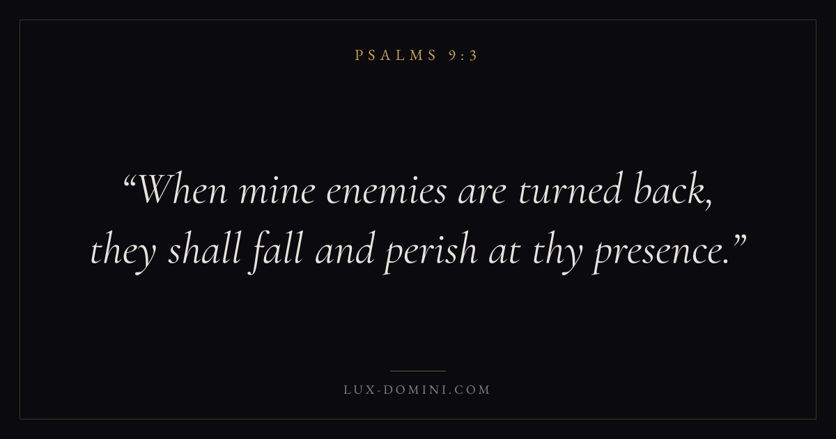 Books / Psalms / Chapter 9 / Verse 3 ← Psalms 9:2 Psalms 9:3 Psalms 9:4 → When mine enemies are turned back, they shall fall and perish at thy presence. Download verse card Share on Twitter Share on Facebook Pin it ✦ Key themes FaithPrayerJustice and mercyPraise Read with Hebrews 11:1Romans 10:17Matthew 6:9Luke 18:1 Related topics Bible verses about faithBible verses about prayerBible verses about justice and mercyBible verses about thankfulness and gratitude ✦ Psalms Chapter 9 verses V. 1 V. 2 V. 3 V. 4 V. 5 V. 6 V. 7 V. 8 V. 9 V. 10 V. 11 V. 12 V. 13 V. 14 V. 15 V. 16 V. 17 V. 18 V. 19 V. 20