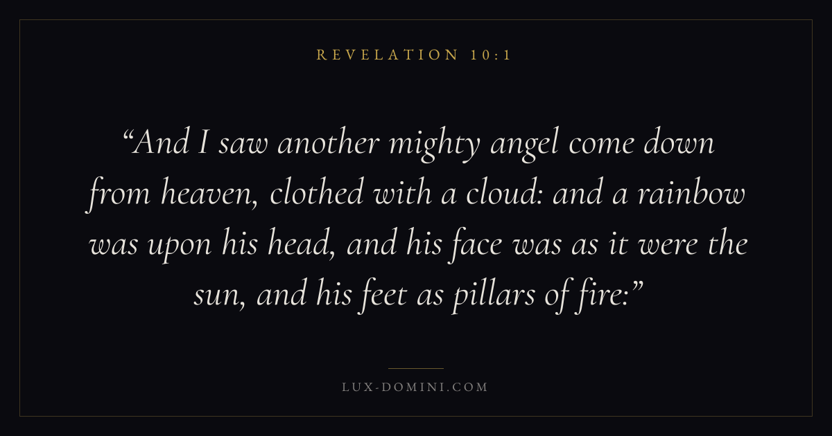 And I saw another mighty angel come down from heaven, clothed with a cloud: and a rainbow was upon his head, and his face was as it were the sun, and his feet as pillars of fire:
