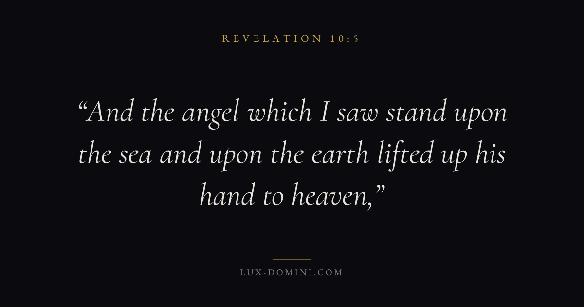 Books / Revelation / Chapter 10 / Verse 5 ← Revelation 10:4 Revelation 10:5 Revelation 10:6 → And the angel which I saw stand upon the sea and upon the earth lifted up his hand to heaven, Download verse card Share on Twitter Share on Facebook Pin it ✦ Key themes Justice and mercyTruthWorshipWitness Read with Revelation 10:1Revelation 10:2Micah 6:8Amos 5:24 Related topics Bible verses about justice and mercyBible verses about truthBible verses about worship ✦ Revelation Chapter 10 verses V. 1 V. 2 V. 3 V. 4 V. 5 V. 6 V. 7 V. 8 V. 9 V. 10 V. 11