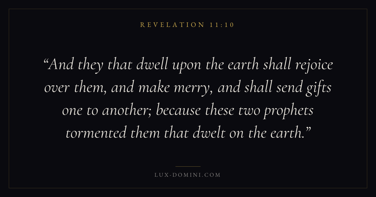 And they that dwell upon the earth shall rejoice over them, and make merry, and shall send gifts one to another; because these two prophets tormented them that dwelt on the earth.
