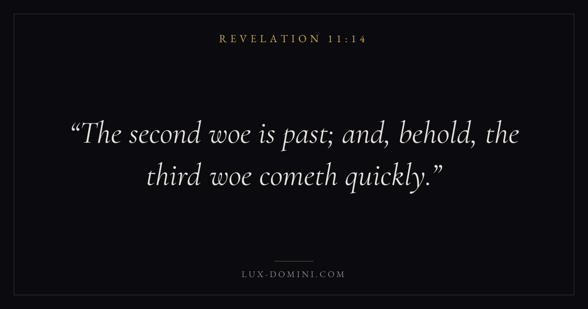 Books / Revelation / Chapter 11 / Verse 14 ← Revelation 11:13 Revelation 11:14 Revelation 11:15 → The second woe is past; and, behold, the third woe cometh quickly. Download verse card Share on Twitter Share on Facebook Pin it ✦ Key themes Justice and mercyTruthWorshipWitness Read with Revelation 11:15Revelation 11:16Micah 6:8Amos 5:24 Related topics Bible verses about justice and mercyBible verses about truthBible verses about worship ✦ Revelation Chapter 11 verses V. 1 V. 2 V. 3 V. 4 V. 5 V. 6 V. 7 V. 8 V. 9 V. 10 V. 11 V. 12 V. 13 V. 14 V. 15 V. 16 V. 17 V. 18 V. 19