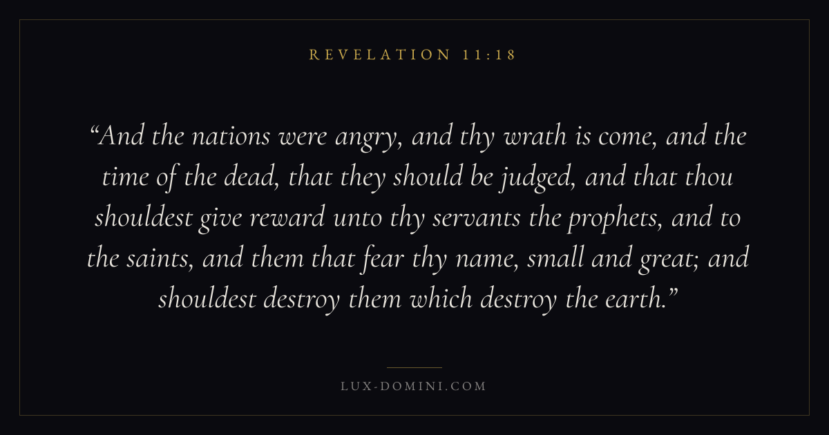 And the nations were angry, and thy wrath is come, and the time of the dead, that they should be judged, and that thou shouldest give reward unto thy servants the prophets, and to the saints, and them that fear thy name, small and great; and shouldest destroy them which destroy the earth.