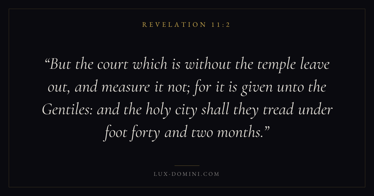 But the court which is without the temple leave out, and measure it not; for it is given unto the Gentiles: and the holy city shall they tread under foot forty and two months.