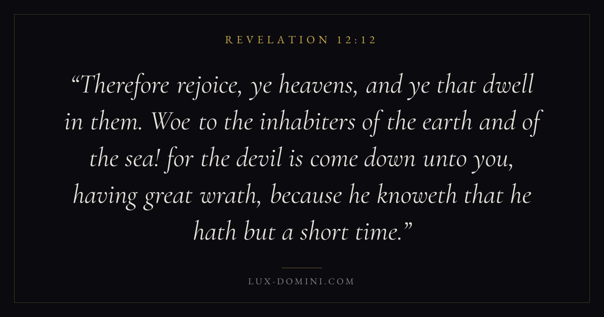 Therefore rejoice, ye heavens, and ye that dwell in them. Woe to the inhabiters of the earth and of the sea! for the devil is come down unto you, having great wrath, because he knoweth that he hath but a short time.