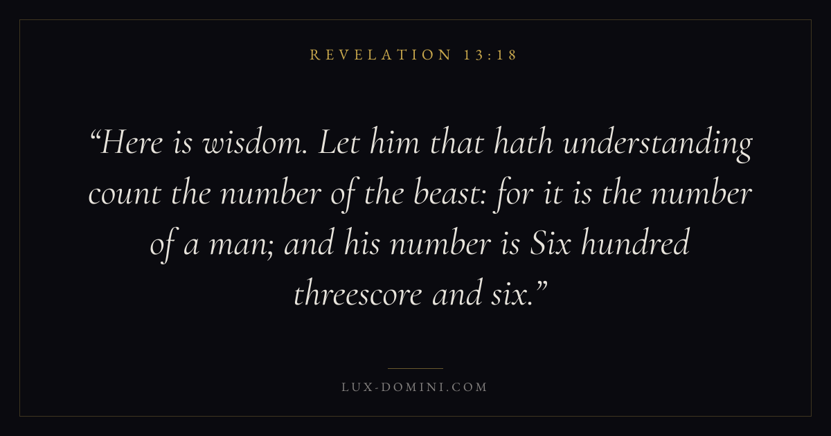 Here is wisdom. Let him that hath understanding count the number of the beast: for it is the number of a man; and his number is Six hundred threescore and six.