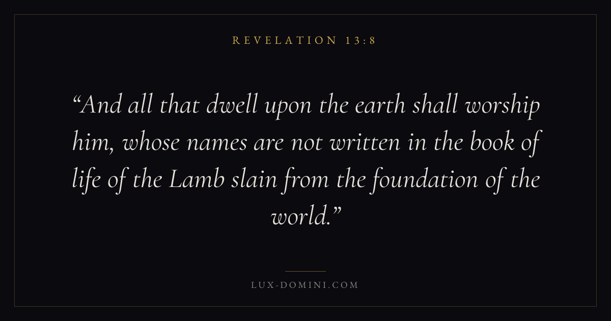 And all that dwell upon the earth shall worship him, whose names are not written in the book of life of the Lamb slain from the foundation of the world.