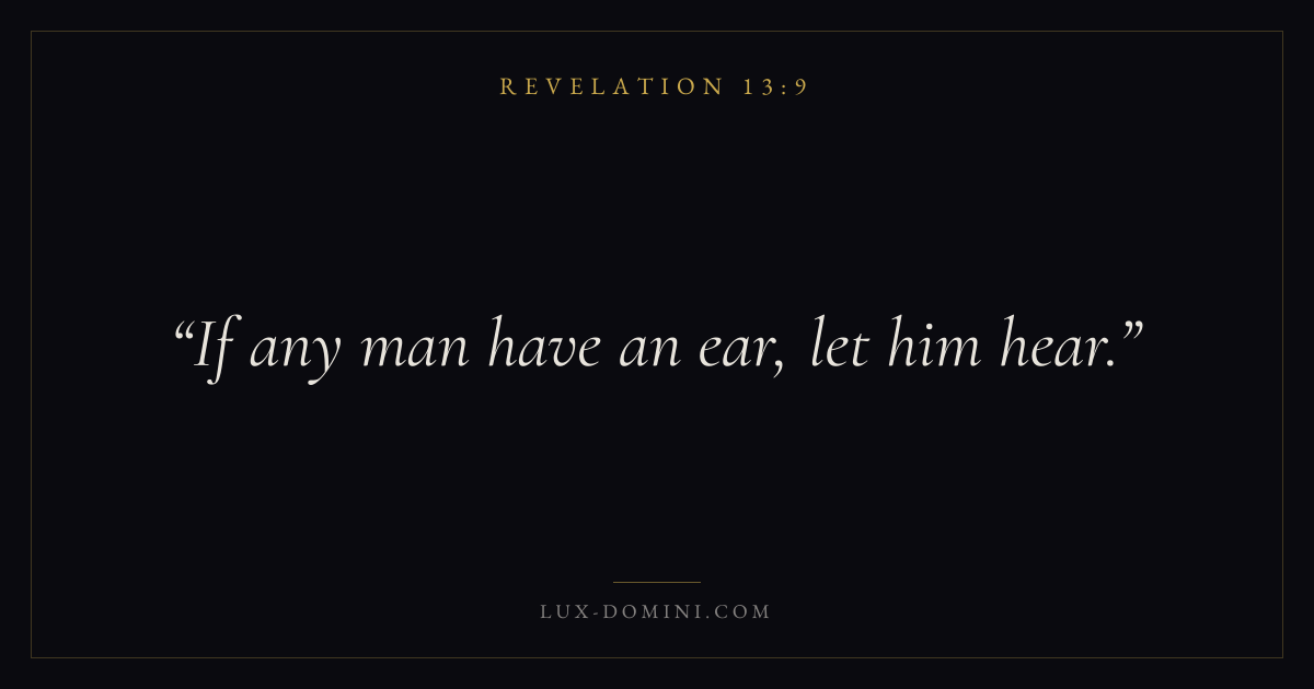 Books / Revelation / Chapter 13 / Verse 9 ← Revelation 13:8 Revelation 13:9 Revelation 13:10 → If any man have an ear, let him hear. Download verse card Share on Twitter Share on Facebook Pin it ✦ Key themes Justice and mercyTruthWorshipWitness Read with Revelation 13:6Revelation 13:7Micah 6:8Amos 5:24 Related topics Bible verses about justice and mercyBible verses about truthBible verses about worship ✦ Revelation Chapter 13 verses V. 1 V. 2 V. 3 V. 4 V. 5 V. 6 V. 7 V. 8 V. 9 V. 10 V. 11 V. 12 V. 13 V. 14 V. 15 V. 16 V. 17 V. 18