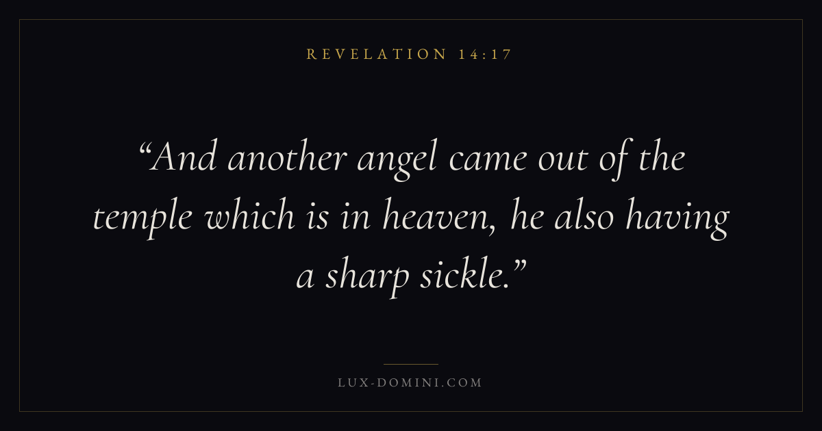 Books / Revelation / Chapter 14 / Verse 17 ← Revelation 14:16 Revelation 14:17 Revelation 14:18 → And another angel came out of the temple which is in heaven, he also having a sharp sickle. Download verse card Share on Twitter Share on Facebook Pin it ✦ Key themes Justice and mercyTruthWorshipWitness Read with Revelation 14:14Revelation 14:15Micah 6:8Amos 5:24 Related topics Bible verses about justice and mercyBible verses about truthBible verses about worship ✦ Revelation Chapter 14 verses V. 1 V. 2 V. 3 V. 4 V. 5 V. 6 V. 7 V. 8 V. 9 V. 10 V. 11 V. 12 V. 13 V. 14 V. 15 V. 16 V. 17 V. 18 V. 19 V. 20