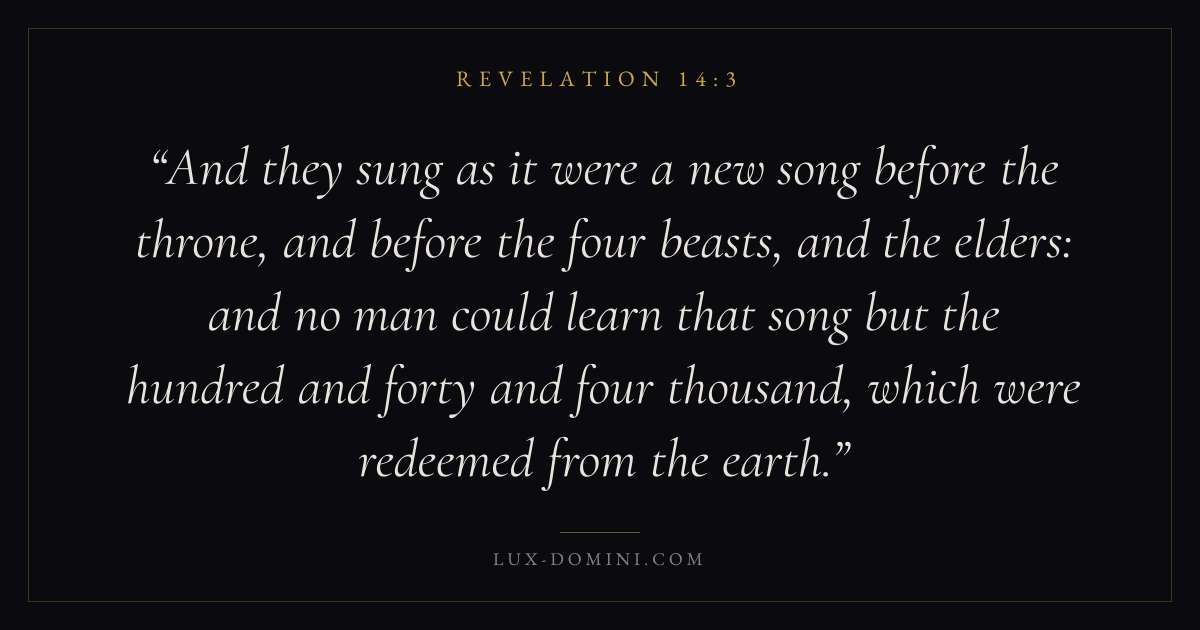 And they sung as it were a new song before the throne, and before the four beasts, and the elders: and no man could learn that song but the hundred and forty and four thousand, which were redeemed from the earth.