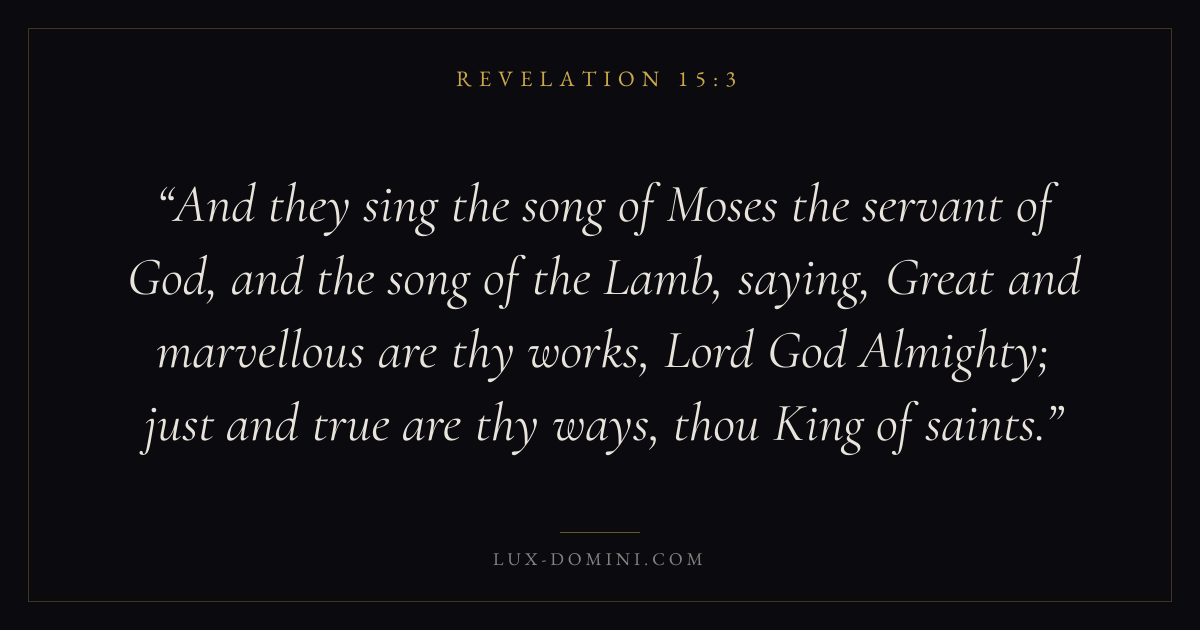 And they sing the song of Moses the servant of God, and the song of the Lamb, saying, Great and marvellous are thy works, Lord God Almighty; just and true are thy ways, thou King of saints.