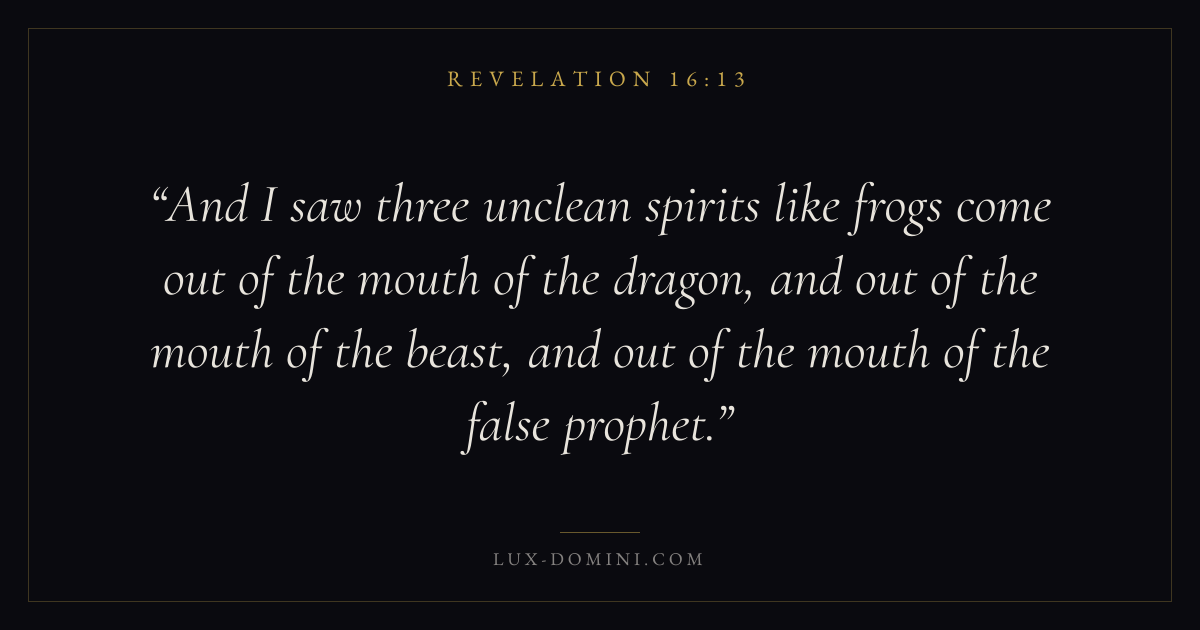 And I saw three unclean spirits like frogs come out of the mouth of the dragon, and out of the mouth of the beast, and out of the mouth of the false prophet.