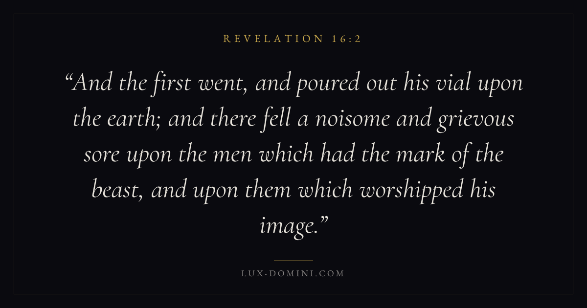 And the first went, and poured out his vial upon the earth; and there fell a noisome and grievous sore upon the men which had the mark of the beast, and upon them which worshipped his image.