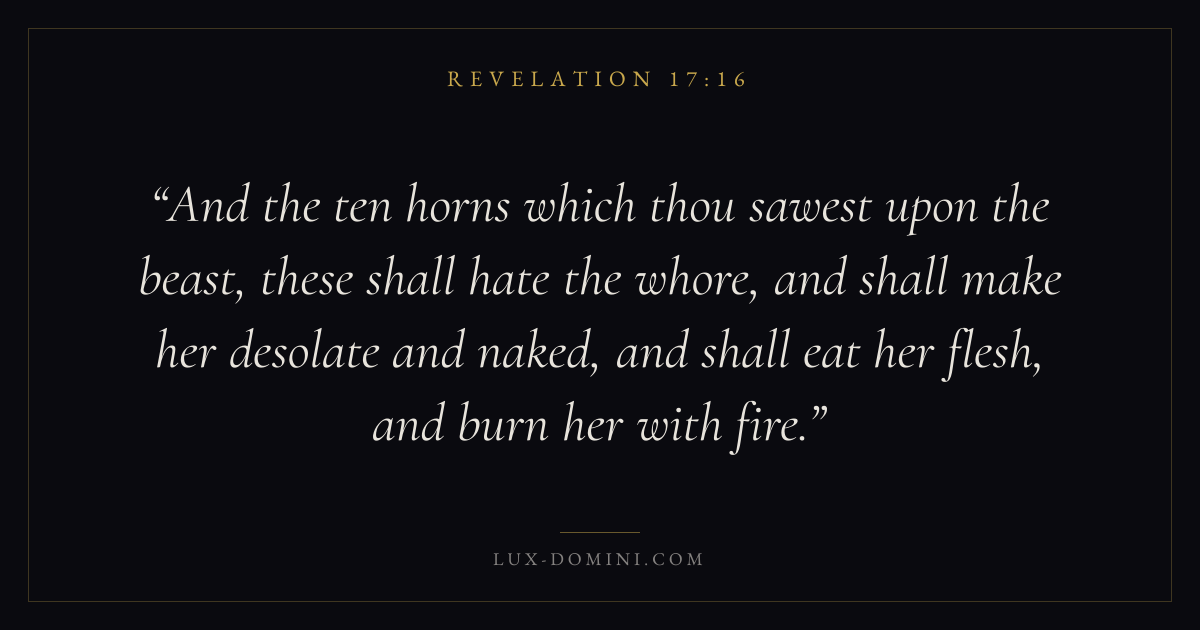 And the ten horns which thou sawest upon the beast, these shall hate the whore, and shall make her desolate and naked, and shall eat her flesh, and burn her with fire.